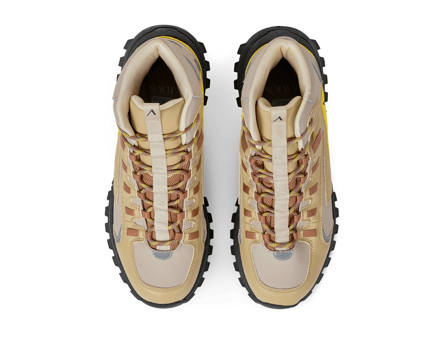 It is a perfect hybrid between the retro and more modern and clean. The graphic lines and almost sculptural look that creates the multi layered upper and the short vamp gives this style the perfect shape. Detailed custom designed looped lacing system, makes the design unique and reflective details on sides vamp gives the style a technical touch.